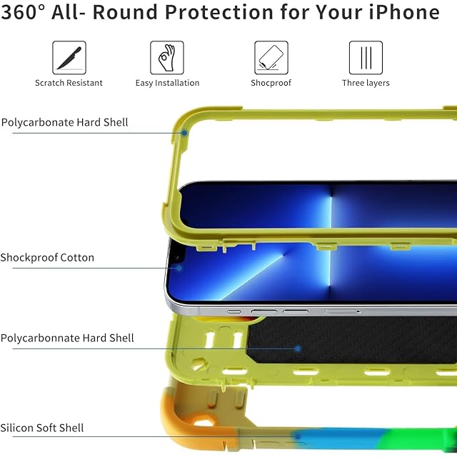 商品名:PboyiqiS For iPhone 16 Pro ケース 耐衝撃 頑丈 360度回転スタンド リング付き付き 虹色 かわいい アイフォン16 プロ ケース 車載ホルダー対応 落下防止 ストラップホール付き アウトドア 子供 仕事用 (虹色黄, iPhone 16 Pro)