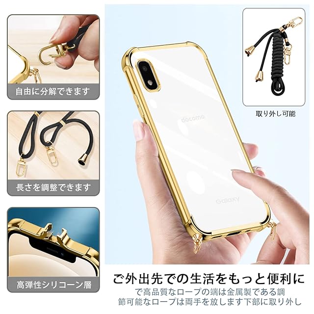 商品名:Galaxy A21 ケース クリア ショルダー 耐衝撃 galaxy docomo SC-42A SCV49 マホケース ギャラクシーa21 カバー 薄型 galaxy a21 対応ケース TPU 軽量 肩がけ 首掛け 紐付きバンパー カバー ストラップ付き ストラップホール付き 透明 着脱可 調節 Qi充電 ワイヤレス充電 傷防止 (ゴールド)
