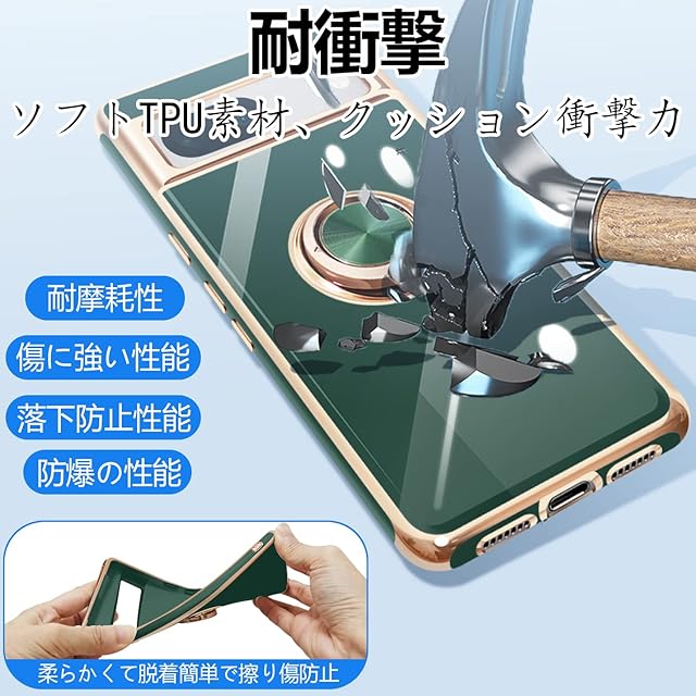 商品名:Google Pixel7 ケース リング付き グーグル ピクセル 7 リング カバー 耐衝撃 TPU メッキ加工 360°回転 スタンド機能 車載ホルダー ストラップホール付き(ダークグリーン)
