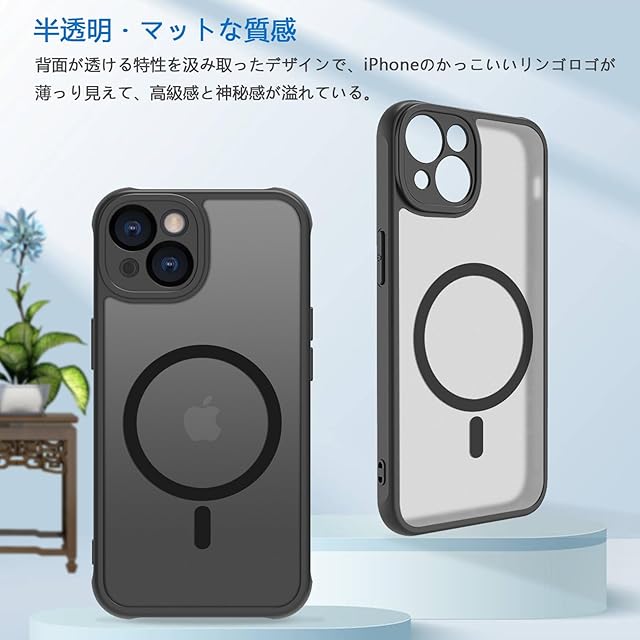 【対応機種】iPhone 専用です。精確にカット加工しているので、ボタンが押しやすく、ポートも使いやすくなっており、機能性に影響しません。<br> 【MagSafe対応・超強磁力】1,900 gの吸着力を備えた強力な内蔵磁石により、吸着力を高めて、安定感をアップしてエネ損失なしの快速ワイヤレス充電できる。様々な状況で安定した状態を保ちます。MagSafeバッテリー、MagSafeカードケース、MagSafeワイヤレス充電器、MagSafeリング、車載スタンドなど様々なMagSafeニーズに対応、Magsafeの便利さを満喫しましょう!<br> 【半透明・マットな質感】背面が透ける特性を汲み取ったデザインで、iPhoneのかっこいいリンゴロゴが薄っり見えて、高級感と神秘感が溢れている。背面のポリカーボネートは耐久性や耐摩耗性に優れ、長く使っても綺麗に見え。スマホに近い感覚を味わうことができ。<br> 【高耐衝撃性・カメラ保護】免震構造である高弾力バンパーと耐震構造である丈夫なポリカーボネート背面で組み合わせて、バランスが良く落下衝撃を本体に伝えにくくなる。隆起エッジにより、スマホを置いた時にスクリーンやカメラが擦れにくくなり、傷から保護することができます。<br> 【スリム・軽量】この握りやすいケースは、厚さたった1.2 cmなので、スマホに近い感覚を味わうことができ、ケースをつけたままコネクタへの接続が可能で。<br> 【品質】iPhone ケースを安心してお使いいただくために、当店は製品に関する品質を提供します。製品に不具合がある場合、注文履歴画面より出品者にご連絡いただき、お問い合わせ内容に応じて、交換などの対応が可能です。<br>