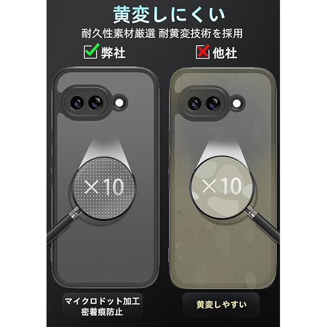 【対応機種】Pixel 9a 用【超高耐衝撃性】角部分にAIRクッション搭載により、落下時の衝撃を瓦解・吸収する効果があり、いくら落としても布団に飛び込んだみたいな感触を与えます。背面は硬いPC素材で作られて側面はSGS認証されたの最高級TPU素材を採用して弾力性があり脱着しやすくて落下などの衝撃を分散・吸収できます。装着の際に本体を傷つける心配もありません。高い耐衝撃性を持て、携帯電話をしっかりと守ります。