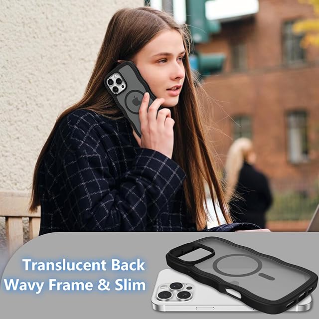 ZTOFERA iPhone 15ケース用,【MagSafe対応】キュートなウェーブの半透明マットスマホケース 女性用 女の子用 男性用 iPhone 15ケース,ブラック