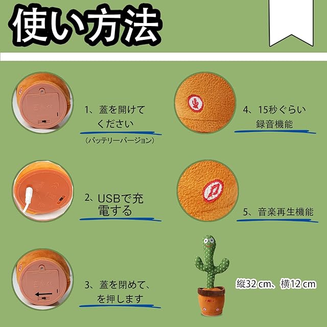 <p>サボテンのおもちゃはUSBタイプです</p> <p>USB: ベーススイッチを入れた後、USB充電ケーブルを差し込んで充電し、充電を完了するのに約3時間かかり、簡単で便利です。1本対応のUSB充电ケーブルをご提供いたします。</p> <br> <p>ダンスサボテンのボタンの使い方は?</p> <p>左ボタン: 録音と会話を学ぶことができます。</p> <p>右ボタン: を押して音楽を再生し、曲が一時停止した後に録音したり、サボテン玩具やサボテン物語玩具を繰り返したりすることができる</p> <br> <p>サボテンの使用前または使用中に次のような状況が発生した場合は、次のQ&Aをよくご覧下さい!</p> <p>Q1: 使っている途中で突然動かなくなった </p> <p>A1: 製品の電力量が十分で、製品の充電に3時間かかることを確認してください</p> <p>Q2: 再生中に音楽の音量が大きすぎたり小さすぎたりする </p> <p> A2: 音量調節ボタンで自由に調節してください。</p> <p>Q3: 録音の音が小さすぎる </p> <p>A3: サボテンに近づいて録音してください。遠すぎると録音の音が悪くなります。</p> <p>Q4: 録音後の声が本人の声しくない </p> <p> A4: 録音機能には弊社による面白い処置が施されているので、より絶対に楽しい気持ちだろう。</p>