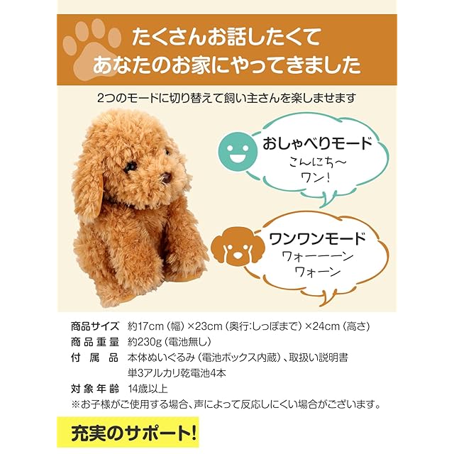 【音声認識ぬいぐるみ】つぶらな瞳とふわふわで心地良い毛ざわりが可愛いコミュニケーションロボット『おしゃべりトイプードル』 簡単な会話を楽しむことができる癒しのワンちゃんです。*おしゃべりトイプードルの声はしばいぬコウタと同じ声を採用しています。【セット内容】本体ぬいぐるみ(電池ボックス内蔵)×1点 取扱説明書×1点 単三アルカリ電池×4点 【サイズ(約)】17cm×23cm×24cm 【重量(約)】230g 【対象年齢】14歳以上 【期間】1年