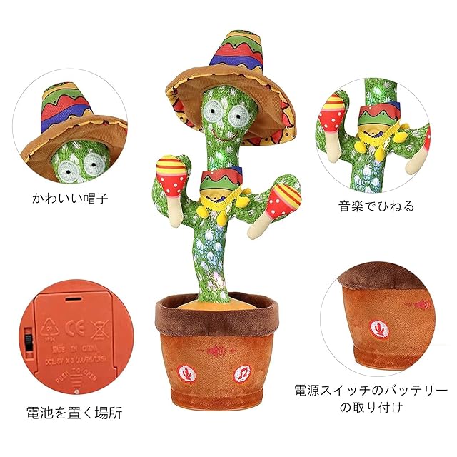 【サボテン おもちゃ 使用上の注意点】1.音楽再生機能:サボテンの右ボタン-1回押して曲を切り替えて、3秒長押しして曲を2回繰り返します。2.録音機能:サボテンの左ボタンを数秒間押して、「di」の音を聞くまで、それから自分の音を録音することができます。 話が終わったら、左ボタンを放してください。もう一度左ボタンを押すと録音が再生されます。新しい録音を行う場合は、上記の手順を繰り返します。3.バッテリは含まれていません 。4. 使用しない場合は、バッテリを取り外す必要があります。 不必要な損失を招くことがないようにします。