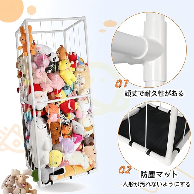 【細部へのこだわり】ぬいぐるみケージは丈夫なPVCで作られており、伸縮性のあるストラップはぬいぐるみの保管と取り出しが簡単になるように設計されています。底部のダスト布は、ぬいぐるみが汚れや湿気にさらされるのを防ぎます。