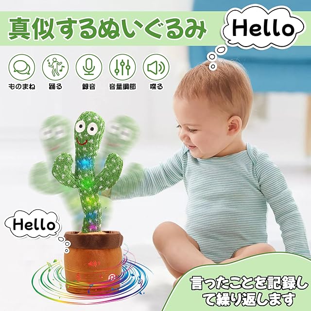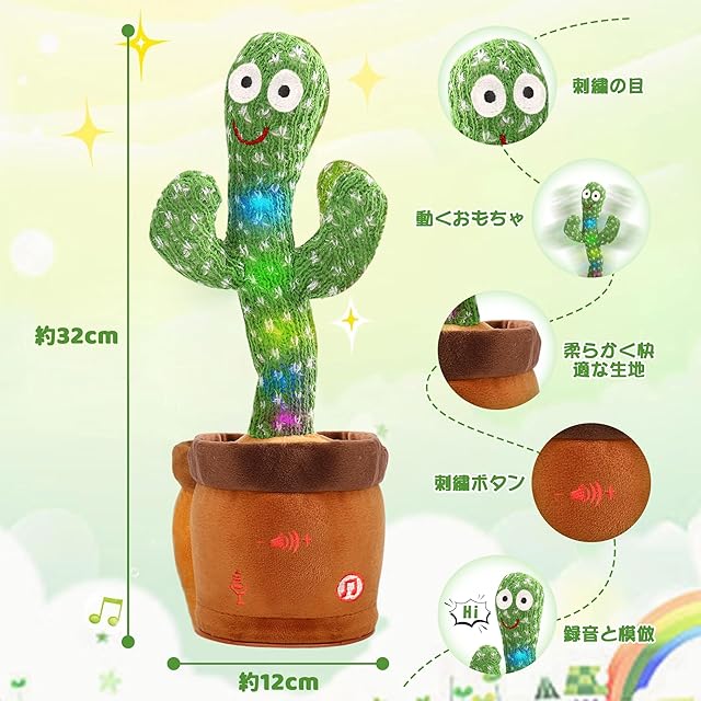 10曲の英語の子供の歌を歌うことができます。歌ったり踊ったりことができるのでとても面白いです。さらに、それは言ったことを記録して繰り返します。もちろん、この音はあなたのオリジナルの音ではありませんが、処理後のより興味深い音色です。サボテン おもちゃの外観をグレードアップし、刺繍ボタンだけでなく刺繍目もあります。