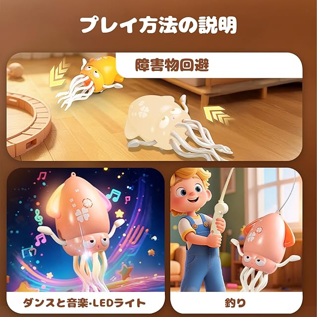 【ダンシングイカおもちゃ】 ユニークな動きで笑顔を誘う、魅力あふれるタコ型ロボット。鮮やかなライトと心地よい音楽がリズムに合わせて点滅し、楽しい時間を演出します。LEDライト&音楽機能:楽しい音楽に合わせてLEDライトが同期して点滅し、より魅力的な視覚効果を生み出します。
