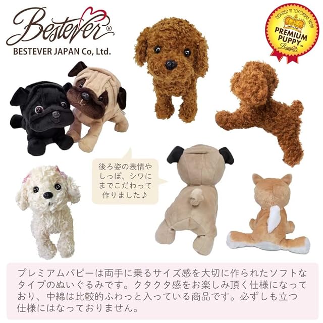 ベストエバージャパンが自信をもってお届けする、その技術と表現力を存分に発揮したプレミアムパピー。手足の先にはビーズ、そしてそれぞれの犬種にぴったりあった最高の手触りの生地を使用。前から見ても、横から、後ろから見てもカワイイパピーです。